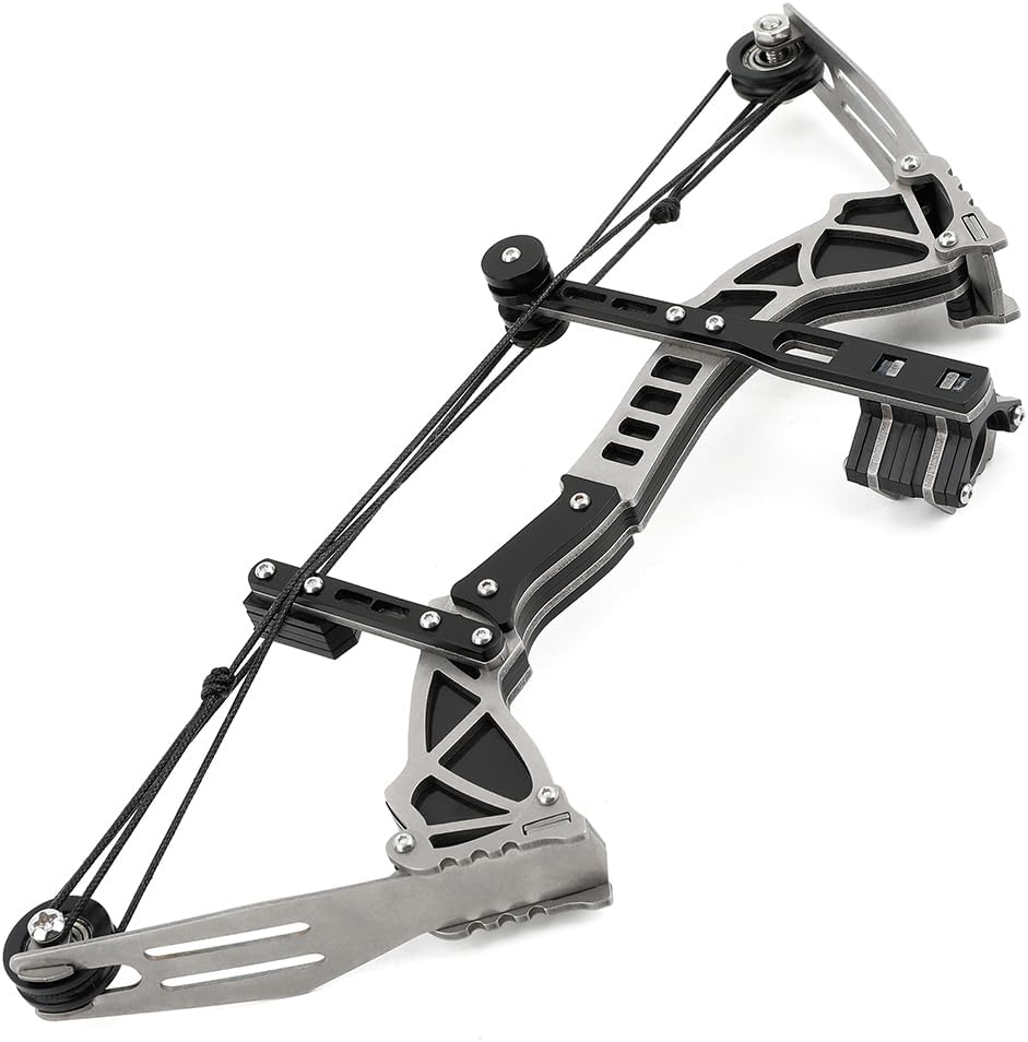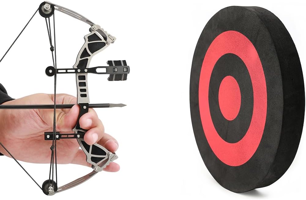 Specifications: Item Name: Bow and Arrows Set Material: Stainless steel Draw Weight: 12lbs Bow Weight: 148.5g(5.2oz) Bow Size: 24.2×9.7×2.4cm / 9.5"x 3.8"x0.94" Shooting Range: about 15-20 meters (49-65ft) Arrow Shaft: Plastic, 18.2cm length Arrow Points: Steel, 3.4cm length Package Types:Set 1: Mini Compound Bow + 12 Arrows + 1 Target Paper + 1 Wrench Features: 1. Fit for the Adult, or the beginner who wants to try the Archery Shooting. 2.Bow Set includes the bow, arrows, targets. Can play with it when received. 3.Fit for Right/Left Handed Archer. NOTE: Never shoot at person, it's dangerous.