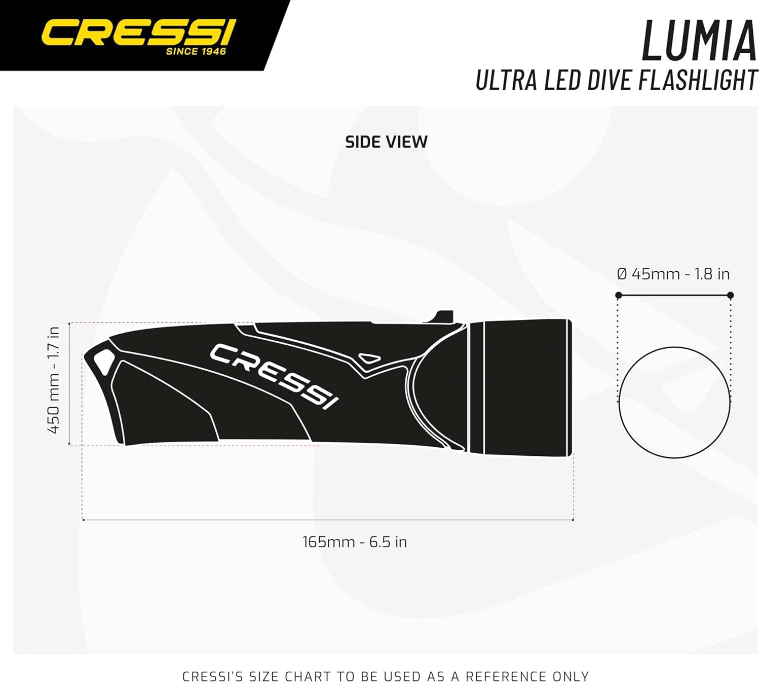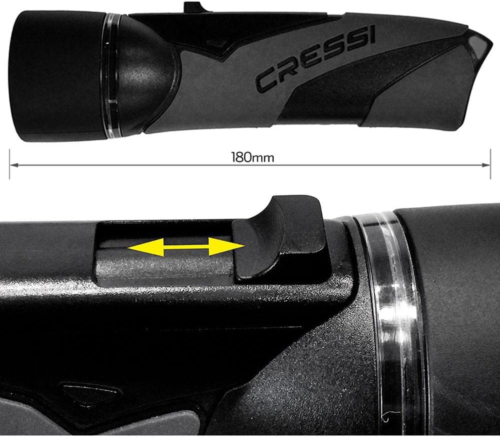The Lumia+ is designed for underwater use. Ideal for scuba diving, freediving, and spearfishing. It's built with a particular LED light specifically for an underwater environment for making vibrant colors. Torch with a highly asymmetric design boasts excellent ergonomics and a highly tactile perception of its geometric characteristics. Thanks to this particular design, the switch position is immediately found without needing to use your eyesight. The porthole and body are coated with thermoplastic rubber to extend shelf life and reduce noises from impact when used for fishing. These ergonomic features are a big advantage over aluminum torches with a circular section which do not give feedback on the position of the grip and, in some cases, even require the use of two hands to turn it on. The switch has three positions: Off, On Unstable with Automatic Return, On. The “On Unstable” position is particularly useful in fishing because it allows flashing by one simple press. The strap with slider spring allows adjustment according to the user’s needs, but being elastic can be pulled out in case of emergency. Power is supplied by four AA “Stylus” batteries, either alkaline or rechargeable. The electronics ensure a constant level of brightness even when the batteries are rechargeable and/or not fully charged. Batteries included. The LED has a white color temperature similar to sunlight for maximum return of the colors in the underwater environment. The light beam of the LED is narrowed into a spotlight beam of about 6° by means of a lens made of ultra-transparent material protected by the polycarbonate optical porthole. Power is supplied by four AA batteries, either alkaline or rechargeable. The power supply has an electronic management system that eliminates the gap between the different electrical potentials of different types of batteries and ensures an efficiency of 30% higher than the commonly used systems. The active electronics of the flashlight guarantee constant light, even when the battery charge decreases. When the charge drops below the safety threshold value, the lighting level will reduce to warn the user that the batteries are depleted. The Lumia+ is designed and manufactured in Italy by Cressi, an Italian brand pioneer in freediving, spearfishing, and scuba diving equipment since 1946. The product is covered by a 2-year limited warranty.