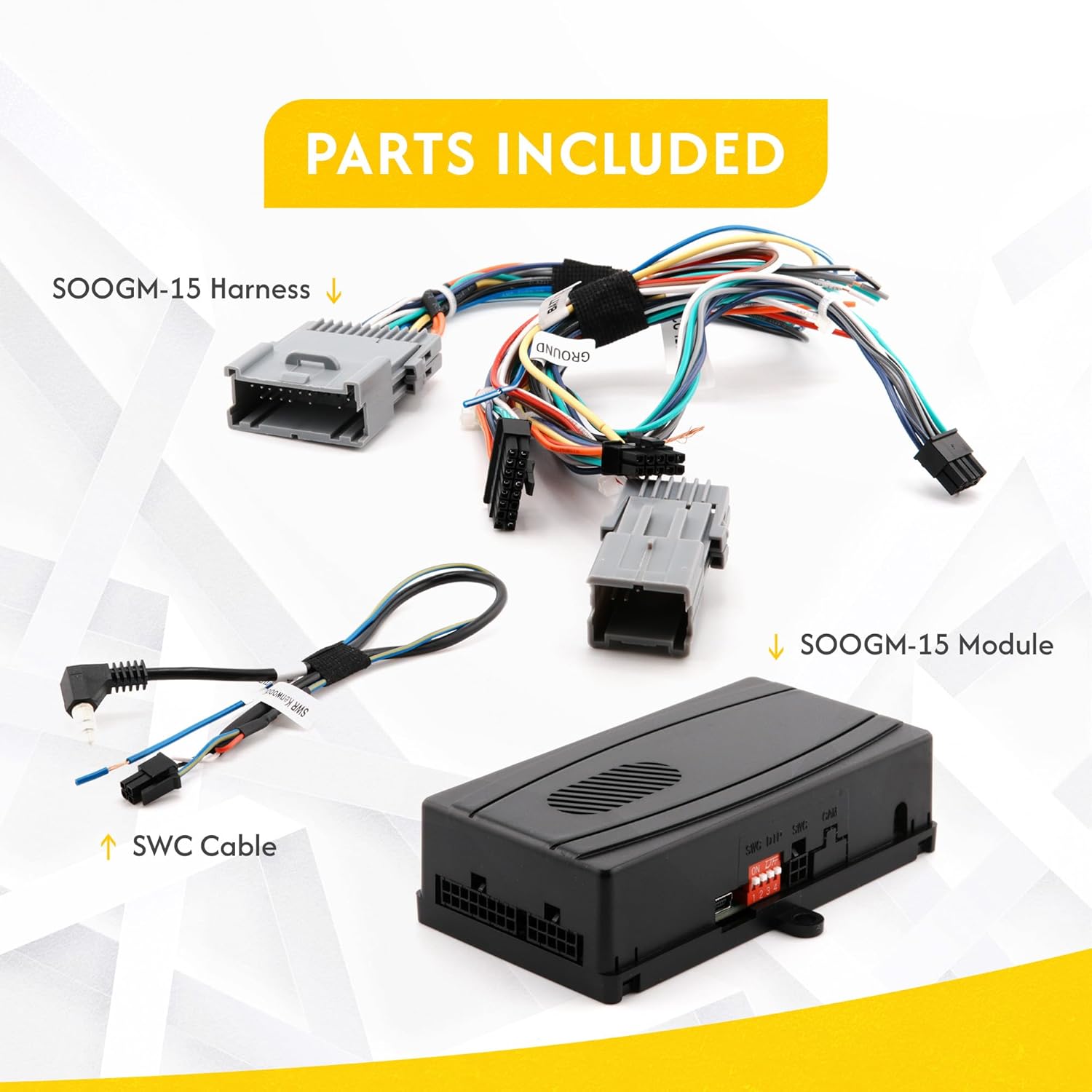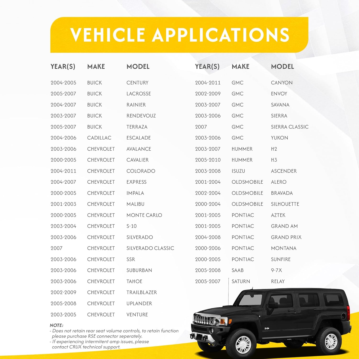 The CRUX SOOGM-15 enables the use of aftermarket radios in select GM Class II Data-bus vehicles, maintaining OnStar functionality with Bose systems, and preserving chime and accessory features. It also retains steering wheel controls in vehicles with digital signals.