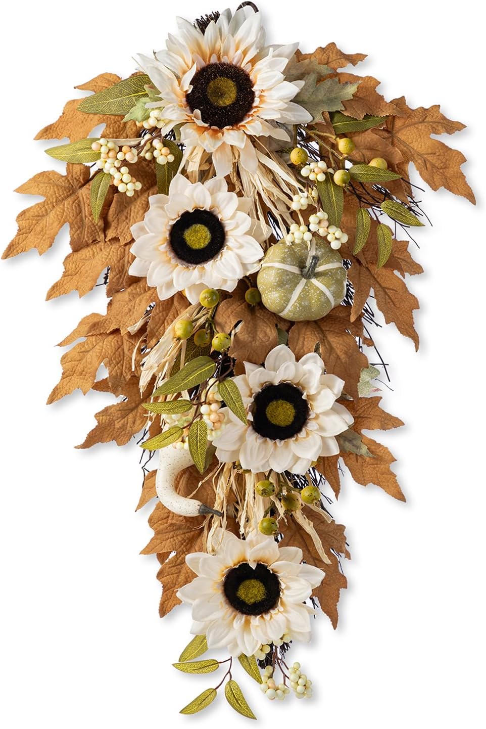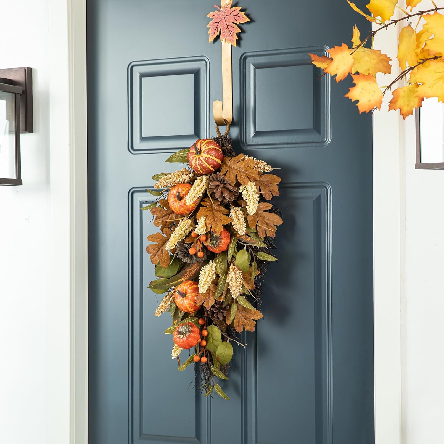 Embrace the beauty of autumn with our 27" Fall Pumpkin Leaf Swag. This exquisite teardrop swag is designed to bring the vibrant colors and natural beauty of the harvest season into your home. Handcrafted from high-quality materials, including polyester, plastic, and wire, and mounted on a natural twig frame, this swag ensures durability and long-lasting charm.The swag features a rich blend of autumn elements, including green leaves, bright pumpkins, rustic pine cones, and berries, creating a visually stunning display that captures the essence of fall. The unique teardrop shape adds elegance and makes it a standout piece in your seasonal décor.Perfect for both indoor and covered outdoor use, this versatile decoration enhances any space with its vibrant and detailed design. Whether adorning your front door, porch, fireplace mantle, or any wall, it creates a warm and inviting atmosphere that celebrates the beauty of autumn.Ideal for adding a festive touch to your home, this swag also makes a thoughtful gift for friends and family, infusing their space with the charm and warmth of the season. Its intricate craftsmanship and harmonious blend of natural elements make it a timeless piece that can be enjoyed year after year, creating cherished memories of the harvest season.Add style, color, and interest to your home with our 27" Fall Pumpkin Leaf Swag. This perfect addition to your seasonal décor transforms your home into a welcoming haven filled with the colors and textures of autumn. Enjoy the cozy ambiance and festive spirit it brings, making your home a delightful place to gather and create cherished memories throughout the fall.