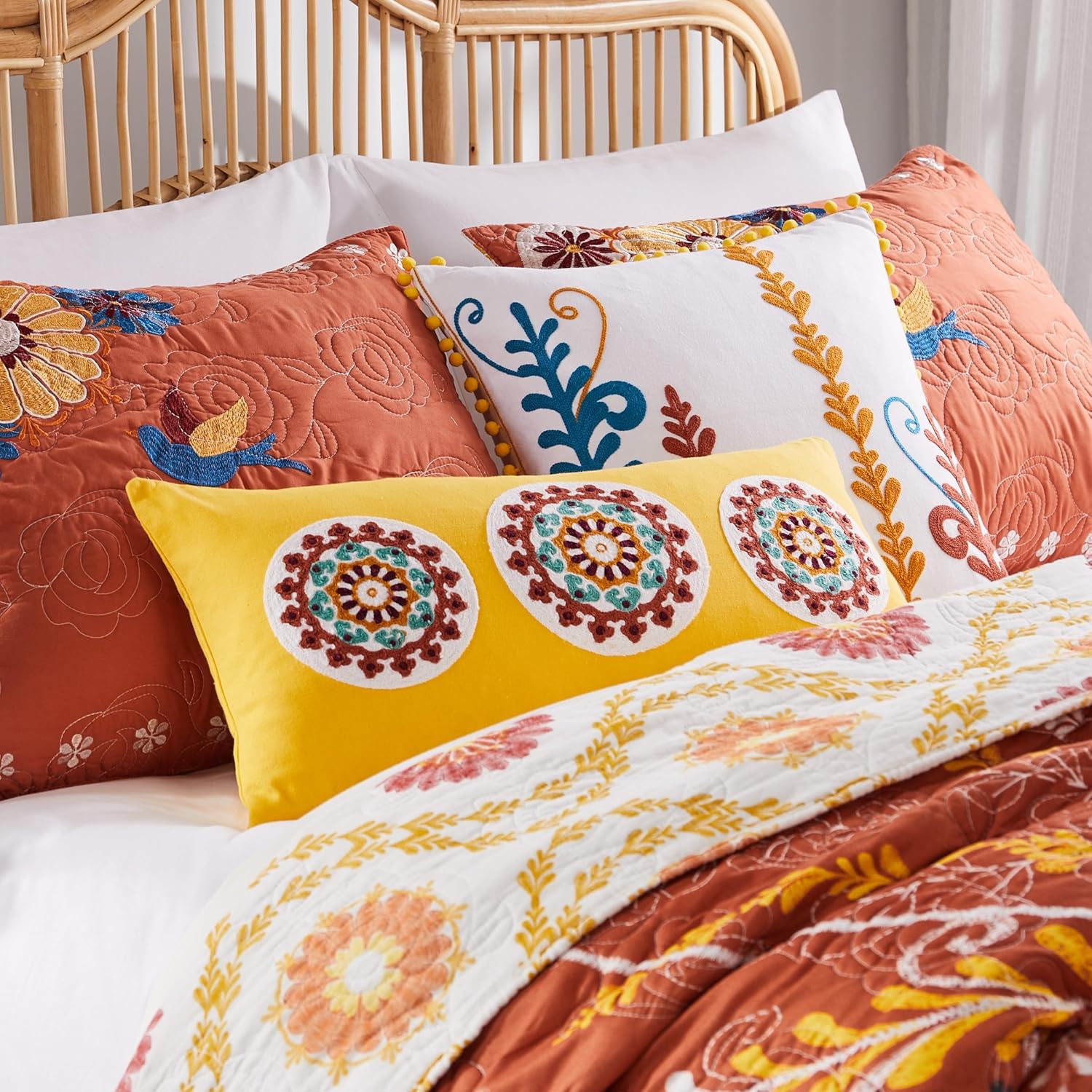 Elevate your living space with this vibrant set of two embroidered decorative pillows, where modern design meets artisanal texture. This curated duo features a 18" x 18" square pillow and a 12" x 24" lumbar pillow, both showcasing intricate, high-contrast embroidery in a palette of sunset orange, deep teal, and sunny yellow. Each piece is adorned with thick, colorful yarn in contemporary botanical and geometric patterns, adding a sophisticated, three-dimensional feel to your sofa or bed. The removable covers are crafted from durable, high-quality cotton canvas. Naturally moisture-wicking and breathable, they help keep you cool and comfortable all year round.