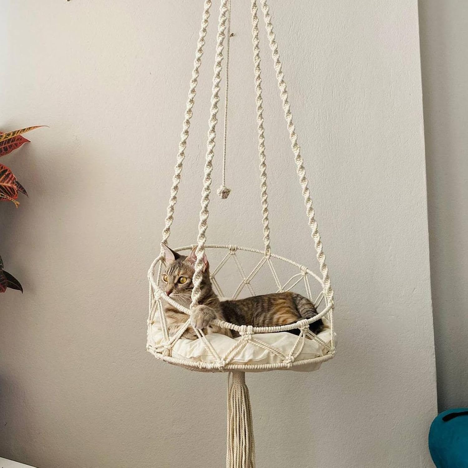 Features: 1. Material: The pet hammock is made of cotton rope and iron, hand-woven, and has a stable structure 2. Comfort: There is a round seat cushion in the middle to provide cats with the comfort experience. Whether taking a nap or playing, cats can enjoy the best rest effect 3. Decoration: The hammock is hung with slender tassels, which not only increases the overall decorative effect, but also provides cats with extra fun to play. Cats can easily grab the tassels and enjoy the fun of swinging 4. Design: One end of the rope is firmly fixed to the top of the hammock to ensure that the hammock is stable when hanging in the air. The rope also has a certain elasticity to provide a gentle swinging feeling for cats 5. Suitable: This cat swing hammock is suitable for placement in suitable locations indoors or outdoors, such as balconies, living rooms or gardens. As long as the fixing point is stable and safe, cats can enjoy this aerial paradise Specifications: Material:Cotton Size:120 x 40cm Weight:850g Package Contents: 1 x Macrame Cat Hammock
