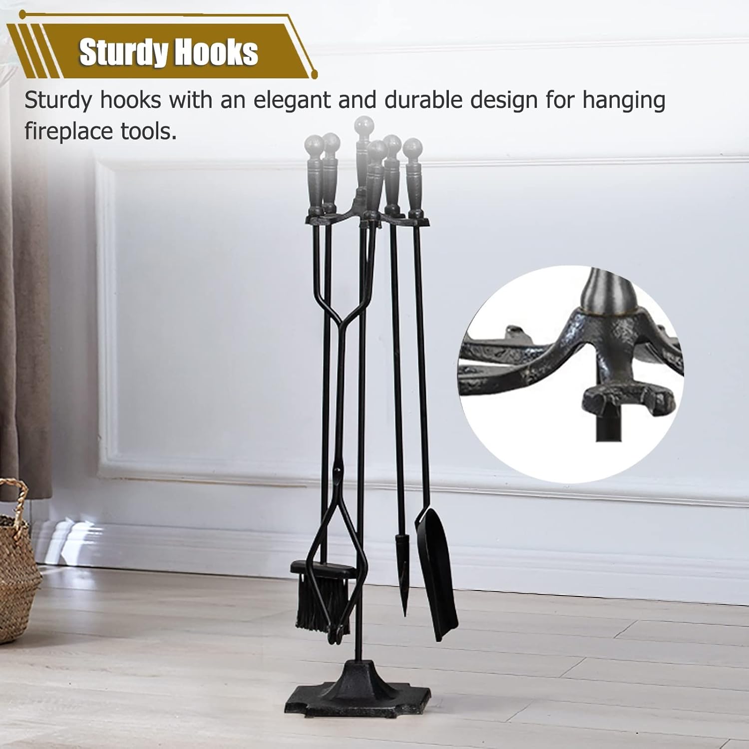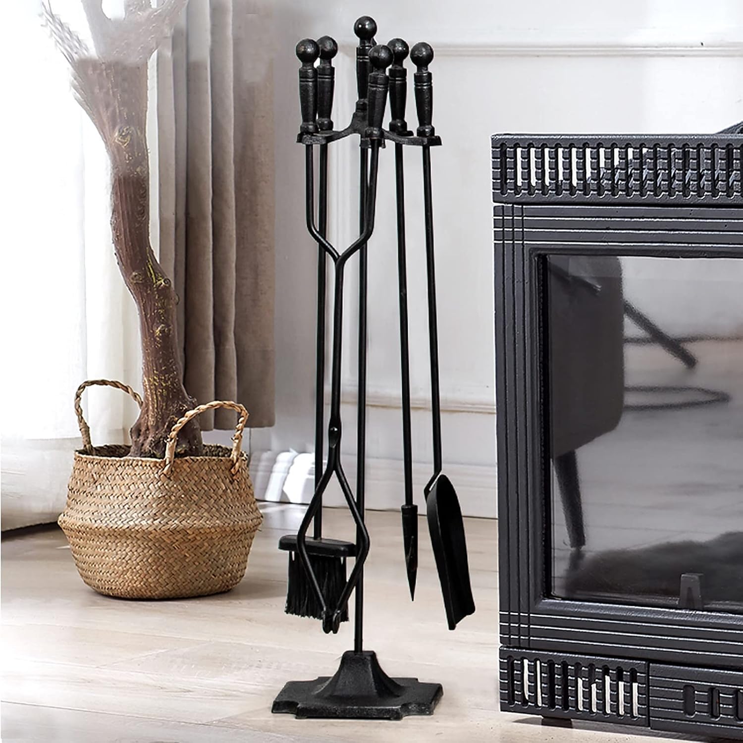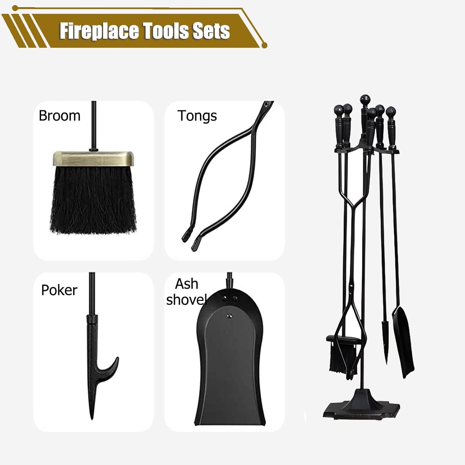 Description: This classic fireplace tool set makes it easy to manage a fireplace or fire pit while bringing an elegant touch to your home. Impress guests with this stylish and practical piece while cozying up to a warm fire. Features: The stand can be taken apart for space-saving storage. Stable base design makes it most sturdy for holding the entire tools. Firm hooks design makes it elegant and for hanging the tools. Stylish look adds a modern touch to the interior design of your house or business. Fireplace tools sets will be a very nice and homey hearth gift idea and a house warming gift for relatives and friends' new house decoration. Our wrought iron fireplace tools are easy to clean, needing only a quick wipe for it to look good as new. Specifications: Material : Iron Color : Black Simple Assemble Needed: Yes Package Contents: 1 × Poker 1 × Tongs 1 × Shovel 1 × Brush 1 × Holder Stand Notice: Due to different batches and manual measurement, there may be slight error, thank you for your understanding. All the above pictures are displayed, and the different display effects may be different. Please refer to the actual product.