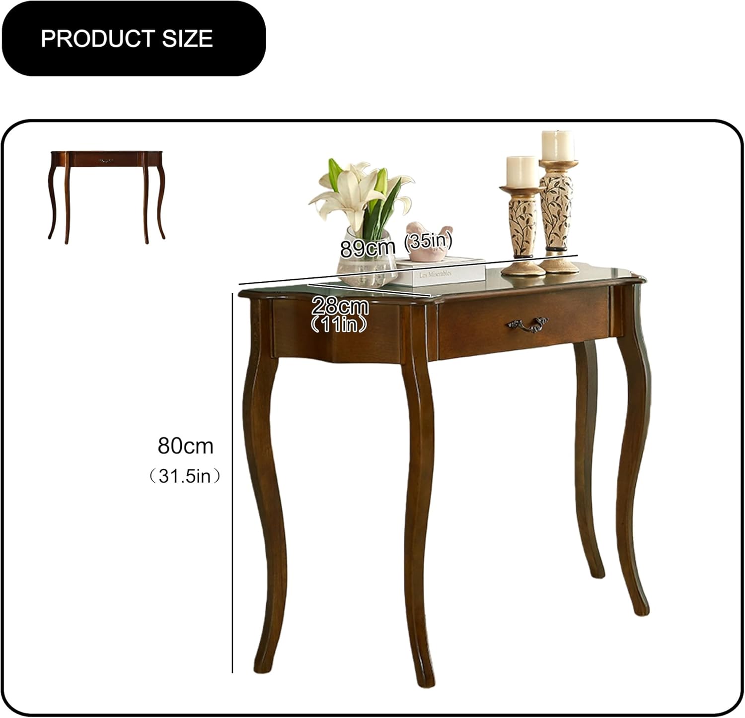 Elevate your home with the WXZXWXZX Classic Console Table, where timeless design meets enduring strength. Featuring elegant curved edges and gracefully arched solid wood legs, this piece brings dignified charm to any setting. Boasting a remarkable 220-lb weight capacity and unwavering stability, it’s as practical as it is beautiful. Effortlessly versatile, serve as a sophisticated console table in your hallway, a charming entryway table, a practical behind couch table. With easy assembly and a design that complements modern farmhouse decor and beyond, it’s the perfect foundation for your favorite decor and daily life.SpecificationsName:Narrow Wood Console Table with Drawer Half-Moon Entryway TableMaterial: WoodPackage:Console Table*1Scene: for Entryway, Front Hall, Hallway, Living Room,Behind Couch