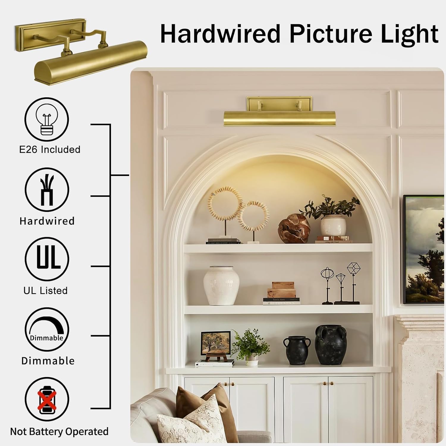| Included Components | 1 pack 18 inch brass picture light, Bulb, All accessories for installation, Pedestal |