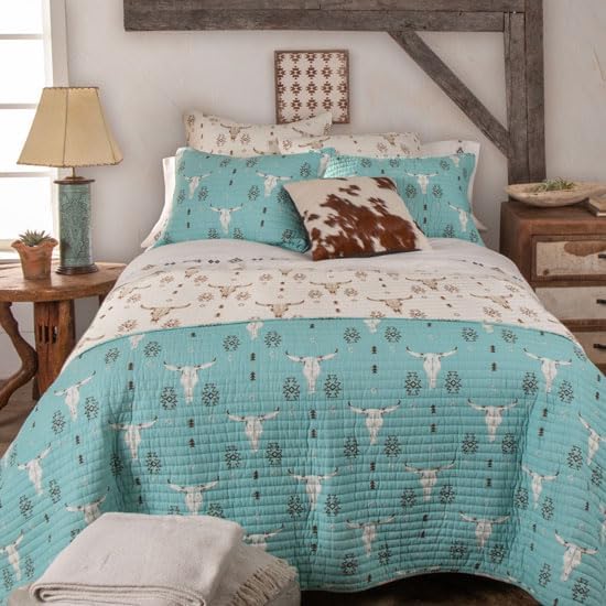 Rod's True WesternUnique skull themed reversible bedding including a simple pattern of longhorn skulls and western motifs in white and brown shades on a soft turquoise background.With a simple flip, you can reveal a stunning reverse side that features the same skull pattern, but this time against a clean white background with brown detailing.Twin quilt measures 68" W x 86" L.Full/Queen quilt measures 88" W x 92" L.King quilt measures 106" W x 92" L.Made of 100% cotton.Machine wash cold, tumble dry low.Imported.13990 Embrace the spirit of the frontier with the Rod's Exclusive reversible Round Up quilt. Adorned with longhorn skulls and western motifs, this quilt allows you to effortlessly switch up your space by using the turquoise or white side!