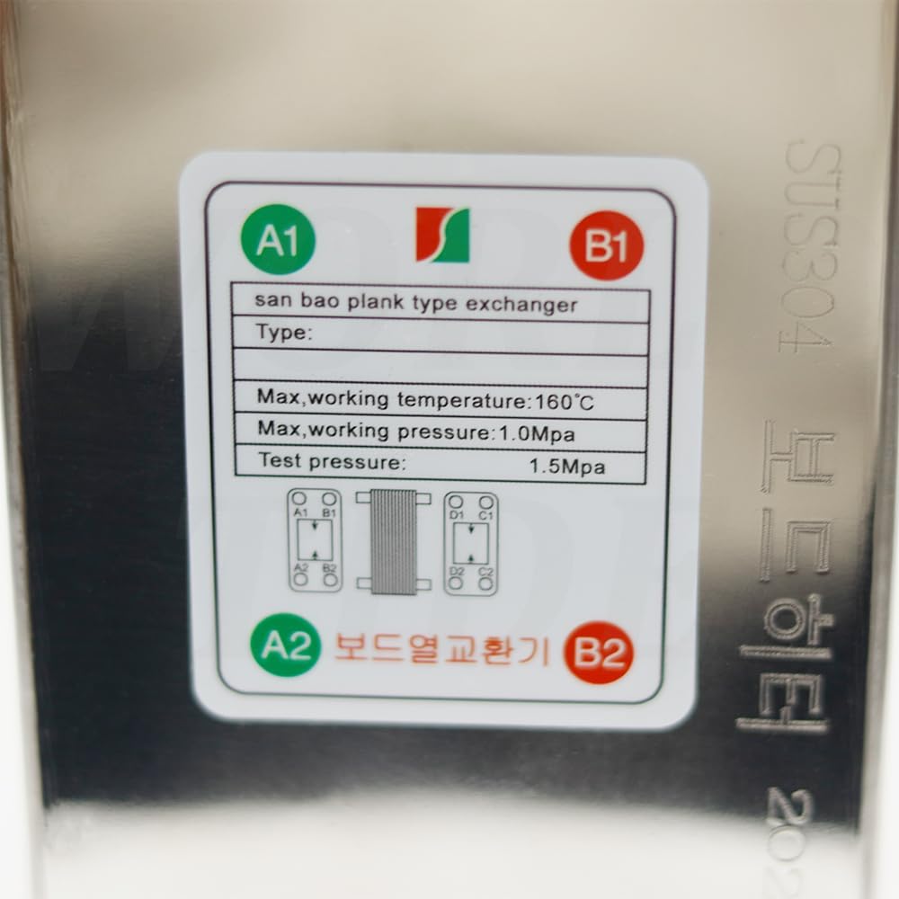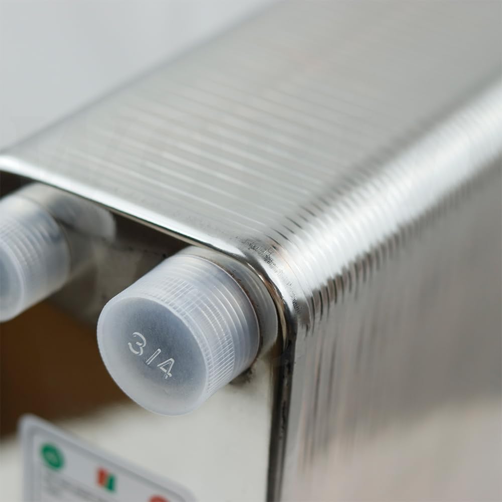 Brazed Plate Heat Exchanger 60 plates Water heater Stainless Steel Small size high efficiency heat exchanger Recirculating chiller Tap water interface: 20mm outer diameter Heating interface:25mm outer diameter selection (if you need 32mm outer diameter, leave a message to inform us of the interface caliber) Name: Brazed plate type heat exchanger Material:SUS 304 Stainless Steel, food grade WeldIing Material: 99.9% Copper Application:Home Brew Wort Chiller, Famliy Hot Water supply Thread of Port A1、A2:1/2" BSPT Male Thread of Port B1、B2:1" BSPT Male Plates Number: 60 plates Dimension:195x85x310mm Heat Transfer Area/plate: 0.028 m2(0.30 ft2) Thickness of One Plate:0.25-0.35mm Working Temperature:-160 ℃ to + 185 ℃ Below 50 plates: suitable for washing hands and face 60-80 plates: suitable for kitchen washing dishes and dishes. 100-120 plates: can support bathing, mainly depends on the heat source's ability to supply heat. Heat exchange rate: 85% Heat source heating capacity> 50 ° C hot water temperature, comfortable bathing Heat source heating capacity <50 ° C, hot water temperature, average bathing experience (winter) Options Instruction: Same side: mean the 4 ports are in the same side Different side: mean the 4 ports are in different side, each side with 2 ports. Please choose it according to your own demand. Thanks. Besides above four ports, there is an air vent on the heat exchanger for 50 plates heat exchanger and above, this air vent's function is to avoid if there is some air remained in the exchanger and you need to release the remain air so that the water can go through when you first time use this heat exchanger. For other time, the air vent need to be plugged