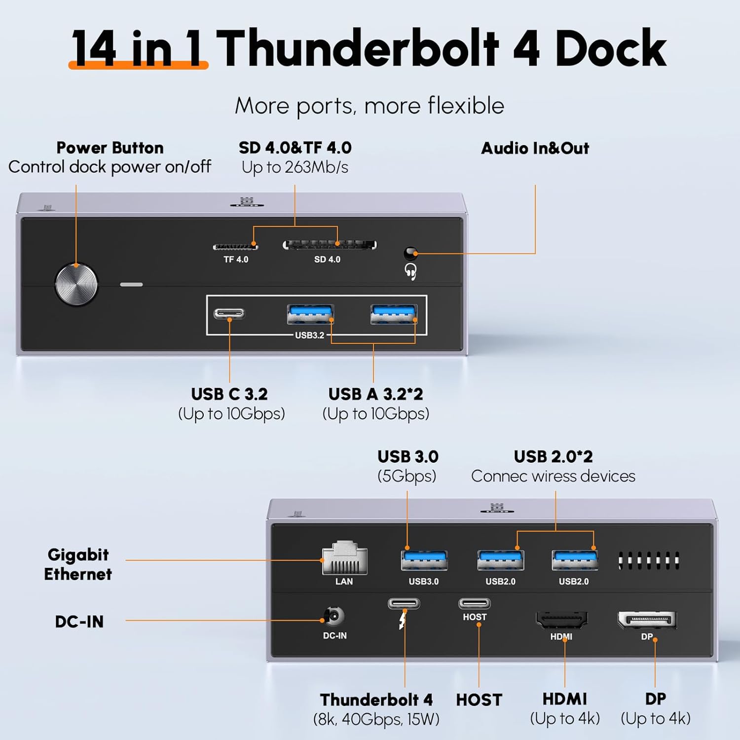 | Compatible Devices | Windows 11 Thunderbolt 4 hosts including Dell Alienware / Chrome Enterprise / G-Series / Inspiron / Latitude / Precision / Vostro / XPS, Acer Aspire 5 Intel / Aspire 5 Spin 14 / Aspire 7 Intel, HP Envy / ProBook / EliteBook / Omen / Pavilion / Zbook , Microsoft Surface Laptop / Surface Laptop Studio / Surface Pro 9 / Surface Book, Lenovo ThinkPad / Legion / ThinkBook / Yoga / IdeaPad, Framework Laptop 13 (Intel), macOS Thunderbolt 3 and Thunderbolt 4 hosts with macOS 11+ including Apple MacBook Pro (M1 Pro/Max, M2 Pro/Max, M3 Pro/Max, M4 Pro/Max)) |